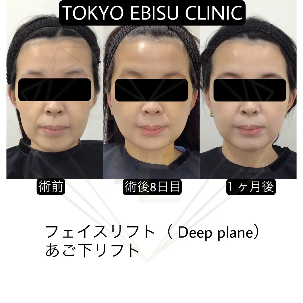| 施術内容 | さて本日は、フェイスリフト(Deep plane)、あご下リフトの1ヶ月後までの症例です💁🏻♀️ フェイスリフトを行った症例の術後経過です。 施術部位や状態を考慮しながら施術を行っています。 ※術後の経過や変化には個人差があります。 |